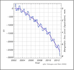 One of the biggest contributors to sea level rise is melting of the polar ice caps. Velicogna and Wahr 2006 predicted that the contribution to sea level rise from Greenland alone would rise from zero to over 1mm per annum between 2002 and 2012. The actual data to support this is to be found……