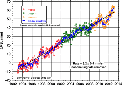The whole structure of figures seems somewhat contrived. However, it does not mean that the figures are outside of the bounds of what could be actually happening. To assess that we must look to the seasonally adjusted sea level rise figures from the University of Colorado.