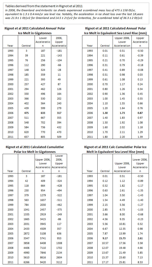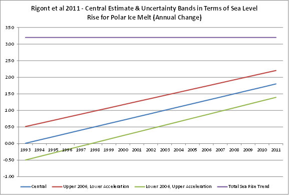 - Rignot et al 2011 estimate that over an 18 year period the acceleration in polar ice melt contribution around 1.8mm extra to annual sea level rise that either stayed constant at 3.2mm, or showed a slight decline. Examination of the Rignot figures suggests this result is a bit too neat.