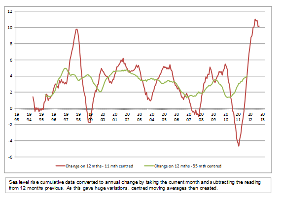 - Moving average figure for sea level rise. But de-smoothing would not only make the movements less of a fit between graphs but would exaggerate the problem. Further, I would expect a lagged response to smudge the sharpness of the initial impulse, not make it more acute.