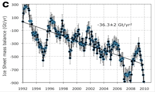 The Rignot et al 2011 paper posts three nice graphs of estimated ice losses. There are separate ones for Greenland and Antarctica, then a combined graph. It is this graph C that I reproduce below.