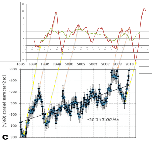 My graph smooth the peaks, as it is a moving average. However, the Rognot graph appears to be almost a mirror of the sea level rise 11-month centred, except ice mass balance has a slope. For instance
