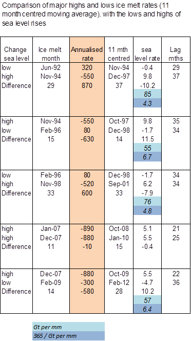 - Although that acceleration in ice melt are not reflected in average long-term rise, large short-term variations ice-melt in the rate of ice melt do show up in swings in the rate of sea level rise two or three years later. In fact using an 11 month moving average sea level rise, the fit on some of those changes in sea levels are almost a mirror image of that rise.