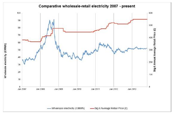 Let us first assume that the scales are comparable. The left hand scale is the wholesale cost in £/MWh. The right hand scale in the average annual retail cost per household. In 2010 the average household was paying about £430 for their electricity, compared with £550 in Jan-2013. The wholesale price component rose from around £280 to £310. So “other costs” rose by around £90. This is a huge increase in costs. With around 26 million households, this is around £2.4bn – well on the way to accounting for the £3.6bn claimed above. There is gas as well remember, so there could be an argument.