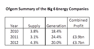 Overall, profits in generation and supply across the half-dozen firms fell from £3.9bn in 2011 to £3.7bn in 2012.