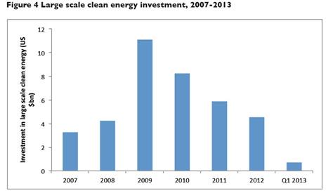 There is an alternative way to interpret this data. Labour lost the general election in May 2010. What might be more significant is the passage of the Climate Change Act 2008. In the next year investment was nearly 3 times higher, then falling each year since. The Climate Change Act 2008 greatly enhanced the incentives for “clean energy” investment, hence the leap. There are only a finite number of opportunities, so the investment is reducing year-on-year. This being despite the biggest source of revenue coming from index-linked subsidies loaded onto electricity bills. Another reason is that many in the industry saw problems with the technology, that are only now coming to light. In particular the lifespan of the turbines might be shorter than previously thought. Further, the opposition to the wind turbines (where most of the investment is concentrated) is increasing, such as against the proposed Atlantic Array that would have blighted the Bristol Channel. Campaigners are also increasingly concerned about noise pollution.