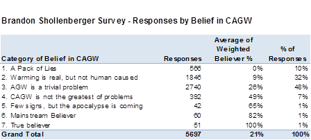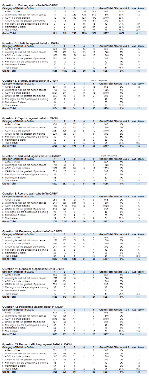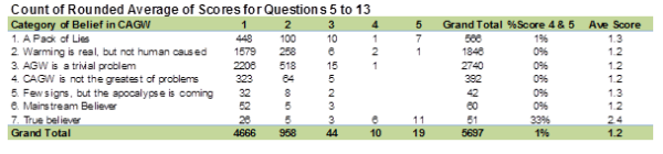 Similarly, with the Shollenberger survey, I have categorised the respondents according to response to the three questions on global warming. This time I weighted the responses in relation to belief in catastrophic anthropogenic global warming. First I changed the 1 to 5 response to a 0 to 4 response. The weightings were then 1 for Ques 1, 2 for Ques 2 and 4 for Ques 3. By dividing by the maximum score of 28, I obtained a “believer” percentage. Questions are below.