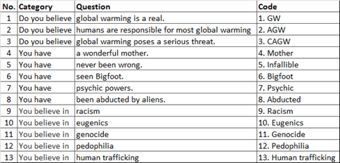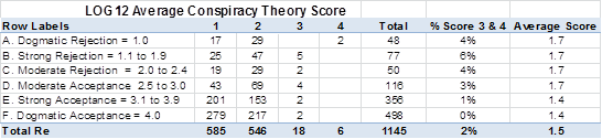 A few hours ago Jo Nova published Shollenberger’s initial findings, as “Warmists Are Never Wrong, Even When Supporting Genocide“. Using the same methodology that Lewandowsky et al (LOG12) “demonstrated” that those who reject the climate religion have a propensity to believe in cranky conspiracy theories, Shollenberger showed that believers in catastrophic global warming have a propensity to believe in genocide, paedophilia and human trafficking. Like for the LOG12, I have run the data through Excel pivot tables to reveal that Shollenberger was successful in undermining LOG12.