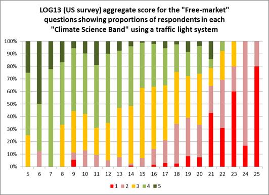 For LOG13 (US survey) study I have plotted the distribution of belief in “climate science” against belief in “free-markets”. With five “free-market” statements and options 1 to 5, the possible scores are 5 to 25. Please note that the X axis is reversed. That is, moving from left to right increases with the rejection of free markets. This is plotted against the rounded average response to the four “climate science” questions1. This “climate science” band I have colour-coded by a traffic light system, with red for reject, amber for neutral and green for accept.