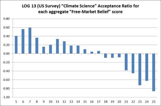 This is shown by the “climate science” acceptance ratios2 against the “free-market” scores.