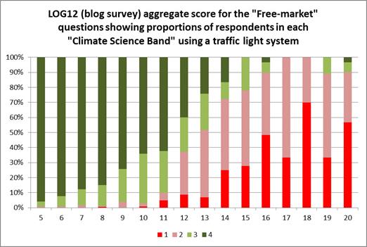 The LOG12 (blog survey) has one extra “free-market” statement. This I have ignored for this study. With only were only four responses to each statement the aggregate possible scores range for five statements 5 to 20. Lack of a neutral option means lack of the amber “climate science band”.
