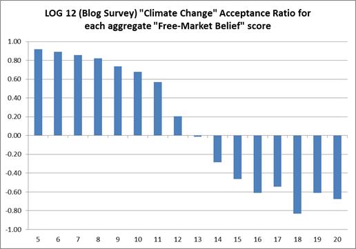 I have found these results by various trying different hypotheses, along with comparing and contrasting between the two surveys. I have only shown my results graphically. The statistical significance of the conclusions can be calculated by others. The key relationship is in the blog survey, for the 955 responses that express overall support for the climate science statements (score 11 to 16). Magnitude of disagreement with the “free-market statements” is a strong predictor of magnitude of support for the “climate science”.