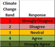 In the LOG13 questionnaire there were 5 options, from 1 for “strongly disagree” to 5 for “strongly agree”. For each respondent, the “Climate Science Band” is obtained by the rounding the average of the questions to the nearest whole number. These bands are traffic light coded as below.