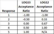 There are two issues with using the average responses. First is that a negative response is a positive number. Second is that LOG12 had only four possible responses for each question, whereas LOG13 had five with the addition of a middle neutral, option. The Acceptance Ratio converts the responses as follows.