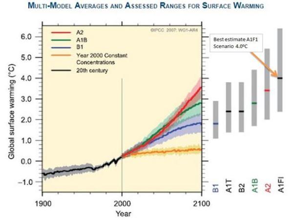 The source info for the prediction of 8oF (4.4oC) warming by 2100 without policy is from the 2007 UNIPCC AR4 report. It is now seven years out of date. The relevant table linked to is this:-