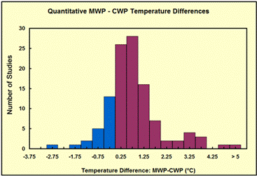 CO2Science.com, in their Medieval Warm Period Project, have catalogued loads of these reconstructions from all over the world. They split them into two categories – quantitative and qualitative differentials in the average temperature estimates between the peak of the medieval warm period and now.