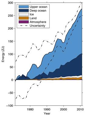 As an encore, Cook had a short presentation on global warming. There were no hockey sticks showing the last thousand years of warming, or even a NASA Gistemp global surface temperature anomaly graph for the last century. The new graph is the earth’s cumulative heat energy accumulation since 1970, broken down into components. It was a bit like the UNIPCC’s graph below from AR5 WG1 Chapter 3. However, I do not remember the uncertainty bands being on Cook’s version.