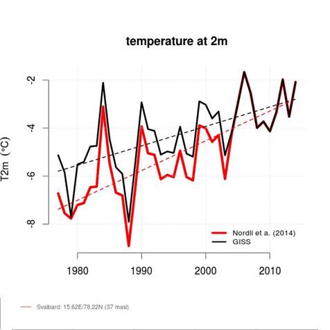 Maybe the phenomenal warming in the raw data for Svarlbard is unprecedented, despite some doubts about the adjustments. Nordli et al 2014 is titled Long-term temperature trends and variability on Spitsbergen: the extended Svalbard Airport temperature series, 1898-2012. Is a study that gathers together all the available data from Spitzbergen, aiming to create a composite temperature record from fragmentary records from a number of places around the Islands. From NASA GISS, I can only find Isfjord Radio for the earlier period. It is about 50km west of Svarlbard, so should give a similar shape of temperature anomaly. According to Nordli et al