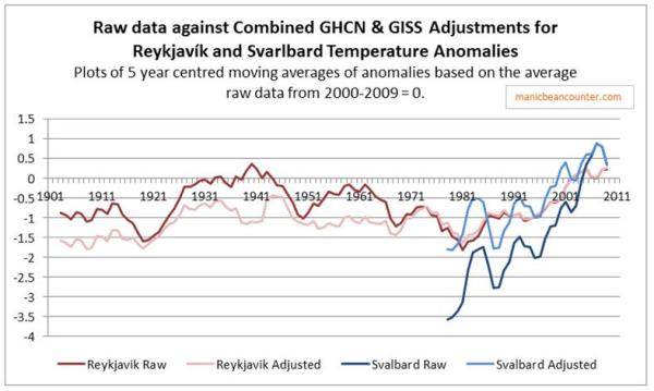 The raw data is in dark, the adjusted data in light. For Reykjavik prior to 1970 the peaks in the data have been clearly constrained, making the warming since 1980 appear far more significant. For the much shorter Svalbard data the total adjustments from GHCN and GISS reduce the warming trend by a full 1.7oC, bringing the warming trend into line with the largely unadjusted Reykjavik. The GHCN & GISS seem to be adjusted to a pre-conceived view of what the data should look like. What Nordli et. al have effectively done is to restore the trend present in the raw data. So Nordli et al, using data on the ground, has effectively reached a similar conclusion to Trausti Jonsson of the Iceland Met Office. The adjustments made thousands of miles away in the United States by homogenization algorithms are massive and unjustified. It just so happens that in this case it is in the opposite direction to cooling the past. I find it somewhat odd Øyvind Nordli, an expert on local conditions, should not challenge these adjustments but choose to give the opposite impression.