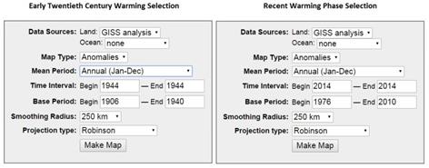 For the current issue, of particular note is the huge variation in trends by latitude from the global average derived from the homogenised land and sea surface data. Delving further, GISS provide some very useful maps of their homogenised and extrapolated data4. I compare two identical time lengths – 1944 against 1906-1940 and 2014 against 1976-2010. The selection criteria for the maps are in figure 2.