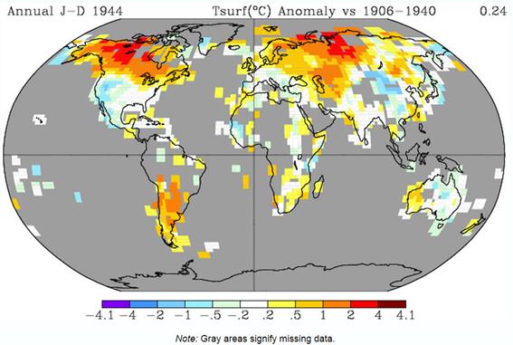 Figure 3. Gistemp map representing the early twentieth surface warming phase for land data only.