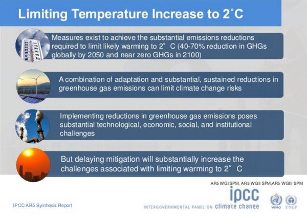 Page 36 has a nice graphic adopted from the IPCC Synthesis Report of 2014, showing the liquid dripping through an egg-timer. It shows the estimate that 2000 billion tonnes of CO2 have been emitted so far, 1000 billion tonnes can be emitted before the 2 C of warming is breached. This was from a presentation to summarize the IPCC AR5 Synthesis Report of 2014. Slide 33 of 35.