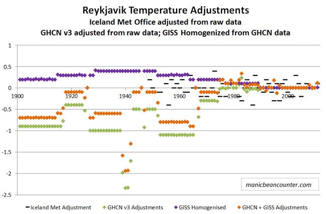 It is the first sentence that was commonly quoted, but it is the last part is the most relevant for temperatures anomalies. There is inevitably a number of homogenisation runs to get a single set of anomalies. For example the Reykjavik temperature data was (a) adjusted by the Iceland Met office by standard procedures to allow for known locals biases (b) adjusted for GHCNv2 (the “raw data”) (c) adjusted again in GHCNv3 (d) homogenized by NASA to be included in Gistemp.