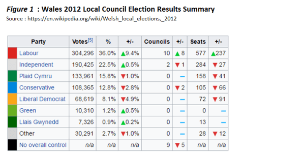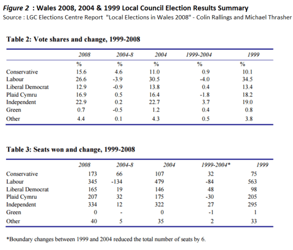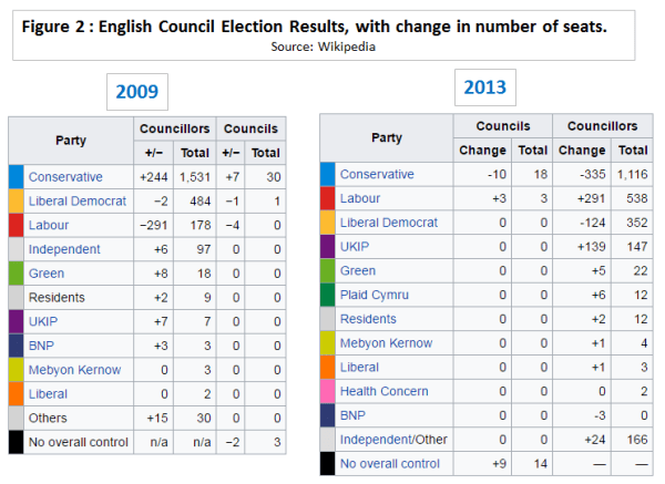 I believe that a major influence on the UK local election results is the state of national opinion. This is in general direction of opinion and not the percentage share of the vote. For instance, in 2007 and 2008 the Labour Government was trailing the Conservatives by quite a long way in the opinion polls – possibly as much as 15 points. By 2012 and 2013 the situation was reversed, with Labour in opposition being around 8 points ahead of the Conservatives. Proportionately, Liberal Democrats as the junior partner in a coalition government, suffered greater reversals than the Conservatives. This is strongly seen in the English council results, with the exception of the UKIP factor. The 2013 council elections demonstrated a game-changing http://www.bbc.co.uk/news/uk-politics-22382098 rise of UKIP outside of elections to the European Parliament. In Wales, the National Opinion influence is less marked, but it is still there. Scotland is the least influenced by National Opinion trends, as there are strong factors unique Scottish factors, such as the replacement of the Labour Party with the SNP as the major left of centre party.