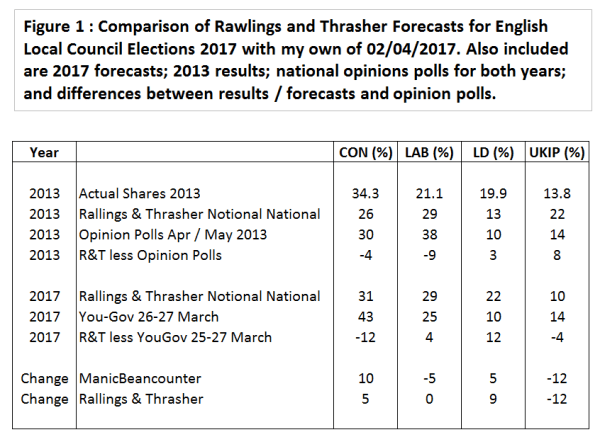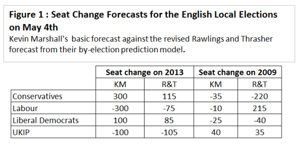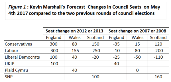 In the last few weeks I have made some results forecasts for the forthcoming local elections in England (here and here), Wales and Scotland occurring on May 4th. I was forecasting some big changes in numbers of seats. Since then a snap General Election has been called for June 8th. This may affect the forecasts, although given I have used mostly GE opinion polls, maybe not quite so much as local election forecasts based more upon recent local election by-election results. Rather than try to reforecast based upon widely fluctuating opinion polls (such as in last Sunday’s papers ), I will try to evaluate the impact of my forecasts being correct in the context of the narrative for the parties for the last few weeks of the General Election campaign.