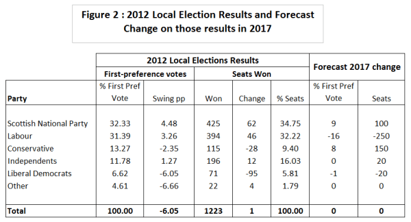 Second, is the growth in the SNP means that the change in the vote from council election to council election does not strongly reflect the swings in the UK-wide opinion polls over the same period. For instance, although the Labour share of the vote in 2012 was higher than in 2007, the rise was much smaller than the SNP rise in vote share. However, I still forecast SNP vote share to increase, resulting in a net gain in Councillors. But these net gains will include very large gains in Labour councils, such as Glasgow, alongside loses elsewhere, especially to the Conservatives. There will be a strong message for those who oppose independence that the SNP juggernaut might have peaked and could signal the turning of the tide on the Independence issue.