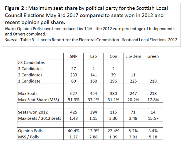 From my forecast the Conservatives will easily replace Labour as the second political party represented on Scotland’s councils. Due to Labour having too many candidates, they could pick up seats in unexpected areas. Conversely, if the Conservative surge continues, then Ruth Davidson may end up apologizing for having too few candidates, as vote share in some wards might easily elect the available candidates.