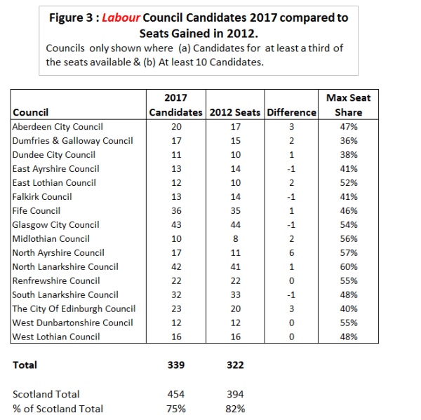 First is that Scotland is embarking on the third set of council elections using the single transferable vote system (STV), with council areas divided into supersized wards of three or four seats. It means that if a party selects too many candidates in a ward, they may end up with less Councillors elected as candidates of the same party compete against each other for votes. They parties therefore try optimization of candidates based on forecasts. As I found, the Labour Party, instead of optimization based on a dramatic forecast fall in their vote, chose to largely match candidates with existing Councillors. They are therefore likely to lose proportionately more seats as a consequence of this quite rational decision.