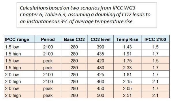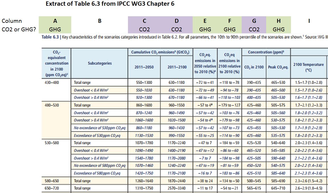 The basic difference between IPCC AR5 Chapter 6 Table 6.3 and the new paper is the misleading message that various emissions policy scenarios will prevent warming breaching either 1.5°C or 2°C of warming when the IPCC scenarios are clear that this is the 2100 warming level. The IPCC scenarios imply that before 2100 warming could peak at respectively around 1.75°C or 2.4°C. My calculations can be validated through assuming (a) a doubling of CO2 gives 3°C of warming, (b) other GHGs are irrelevant, (c) there no significant lag between the rise in CO2 level and rise in global average temperature.
