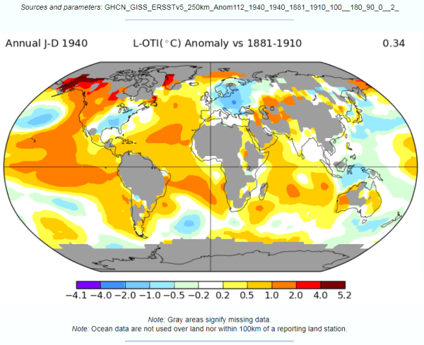 NASA GISS Global Maps from GHCN v3 Data provide maps with the calculated change in average temperatures. I have run the maps to compare annual data for 1940 with a baseline of 1881-1910, capturing much of the early twentieth-century warming. The maps are at both the 1200km and 250km smoothing.