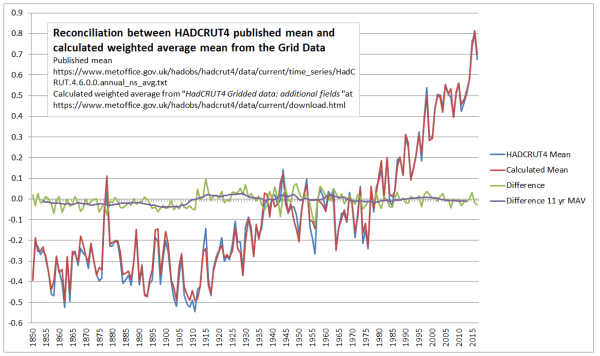 Figure 3 : Reconciliation between HADCRUT4 published mean and calculated weighted average mean from the Gridded Data