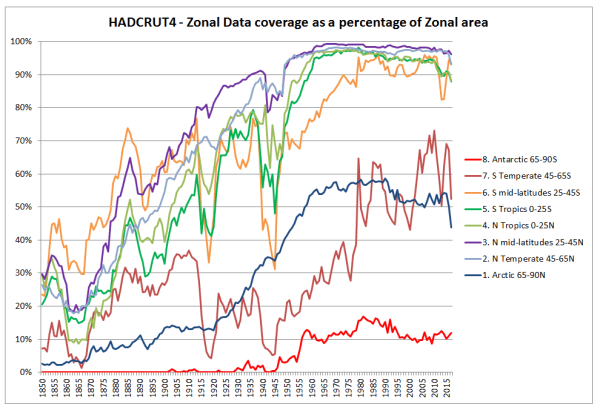 Figure 5 : HADCRUT4 Change in the percentage coverage of each zone in the HADCRUT4 gridded data.
