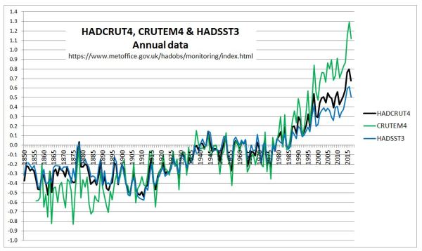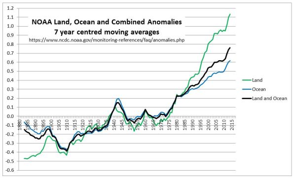 Figure 1 : Graph of Hadley Centre 7 year moving average temperature anomalies for Land (CRUTEM4), Sea (HADSST3) and Combined (HADCRUT4)