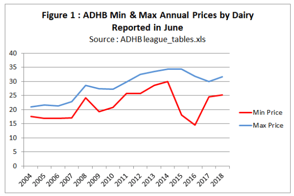 The profits are based upon a constant price of £0.30 a liter. But prices can fluctuate according to market conditions. Data on annual average prices paid is available from AHDB Dairy, ” a levy-funded, not-for-profit organisation working on behalf of Britain’s dairy farmers.” Each month, since 2004, there are reported the annual average prices paid by dairies over a certain size available here. That is 35-55 in any one month. I have taken the minimum and maximum prices for reported in June each year and shown in Figure 1.