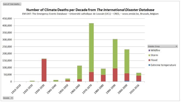 Figure 5 : No of Climatic Deaths per decade from EM-DAT. Note that 2010-2016 pro rata is similar to 2000-2009