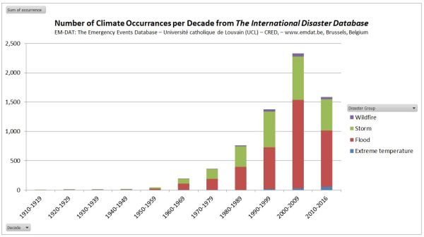 Figure 4 : No of Climatic Occurrences per decade from EM-DAT. Note that 2010-2016 pro rata is similar to 2000-2009