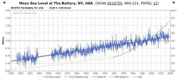 The chart for The Battery, NY shows no discernible acceleration in the last 60 years, despite the acceleration in the rate of CO2 rise shown in green. It is the same for the other tide gauges.