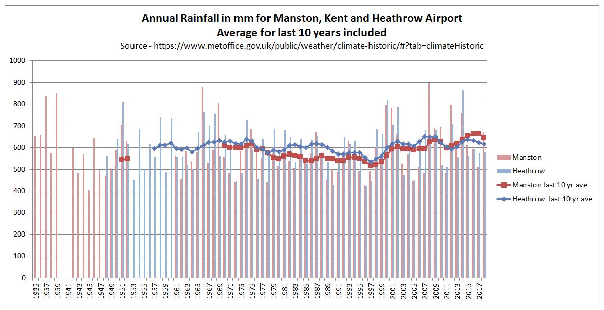 Water availability is not so precise, yet the fall due to climate change of 39 million litres per day is just 7% of existing domestic demand, or 4.3% of total water usage. There are some records at the Met Office of rainfall. In particular in the South East are records for Heathrow Airport and Manston in Kent. I have graphed annual rainfall data, with averages of the last 10 years.