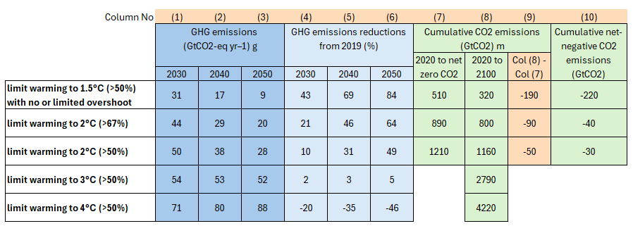 This is a ridiculous comment to make. Why? The climate impact of CO2 emissions is through raising atmospheric CO2 levels, which in turn causes rising global average temperatures. It is believed that this warming could have catastrophic consequences for the planet. So, how much warming will 250 million tonnes of CO2 (0.25 GtCO2) cause? I will first make the assumption that the oil from Rosebank will add to global oil consumption and not be instead of oil from say Russia, the Middle East, or Venezuela. The most authoritative source of data is from the UN IPCC Assessment Reports. In particular, from the 2021 AR6 WG3 Summary for Policymakers. This states historical cumulative net CO2 emissions from 1850 to 2019 were 2400 ± 240 GtCO2 (high confidence). A footnote on page 10 states that the ± 240 is at the 68% confidence interval. In statistics, a 95% confidence interval is conventional, which is double the ± 240 GtCO2. In AR6 various emissions pathways were calculated using that figure. Figure 1 is an extract from “Table SPM.2 | Key characteristics of the modelled global emissions pathways” on pages 18-19, looking at the additional emissions to reach various warming levels in 2100.