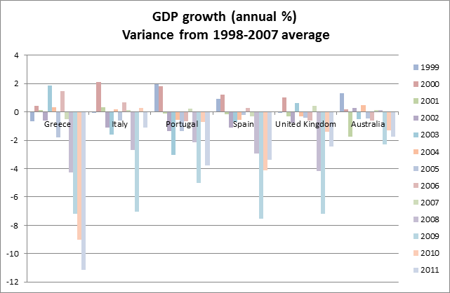 Overall, the conjecture that global warming is resulting in increased coral bleaching in the Great Barrier Reeg directly through rising average temperatures, or indirectly through greater volatility in temperature data, is not supported by the HADSST3 surface temperature data from either the North or South of the reef. This does not necessarily mean that there is not a growing problem of heat stress, or though this seems the most likely conclusion. Alternative explanations could be that the sea surface temperature anomaly is inadequate or that other gridcells show something different.