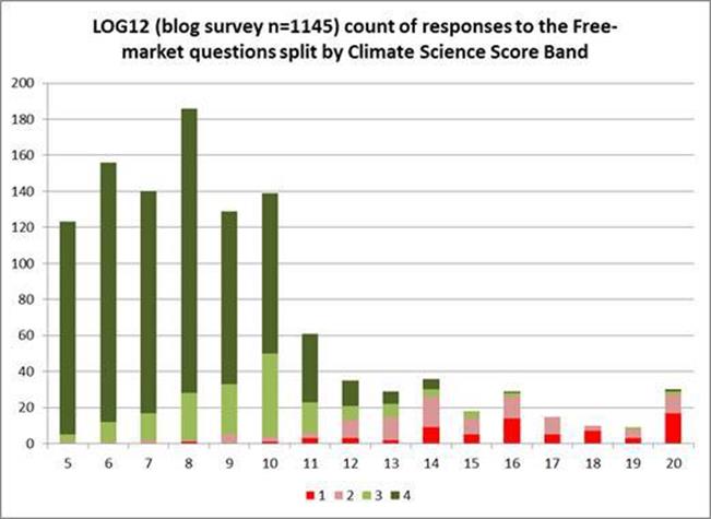 The blog survey (which was held on strongly alarmist blogs) shows that most of the responses were highly skewed to anti-free market views (that is lower response score) along with being strongly pro-climate.