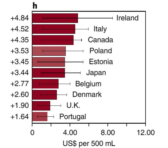 In the UK and Ireland there are similar high taxes on beer, with Ireland being slightly more. Both countries have lots of branches of the massive discount chain. They also have some products on their website aldi.co.uk and aldi.ie.  In Ireland a 500 ml can of Sainte Etienne Lager is €1.09 or €2.18 a litre or £1.92 a litre. In the UK it is £2.59 for 4 x 440ml cans or £1.59 a litre. The lager is about 21% more in Ireland. But the tax difference should only be about 15% on a 5% beer (Saint Etienne is 4.8%). Aldi are not making bigger profits in Ireland, they just may have higher costs in Ireland, or lesser margins on other items. It is also comparing a single can against a multipack. So pro-rata the £1.80 ($2.35) bottle of beer in the UK would be about $2.70 in Ireland. Under the RCP 8.5 scenario, the models predict the bottle of beer to rise by $1.90 in the UK and $4.84 in Ireland. Strip out the excise duty and VAT and the price differential goes from zero to $2.20.