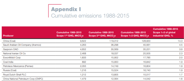 This is not science, but blinkered ideology. Why blinkered? Try going to the CDP Carbon Majors Report 2017 Appendix 1 – Cumulative emissions 1988-2015 %. Below are the top 10.
