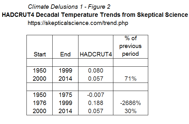 With the HADCRUT4 temperature trend it is not so easy to claim that there is no significant slowdown. But the full claim in the Karl et al paper to be a pause-buster can only be made by a combination of recalculating the temperature anomaly figures and selection of the 1950-1999 period for comparing the twenty-first century warming. It is the latter part that makes the “pause-buster” claims a delusion.