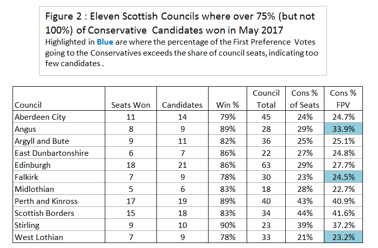 Figure 1 shows the seven Scottish Councils where all the Conservative Candidates won seats. Given that (a) of the 337 wards with Conservative candidates 296 had only one candidate, and (b) that support for any Party tends to vary across wards, the fact that every candidate one suggests too few candidates. Aberdeenshire and Moray stand out most clearly in this respect, as the total FPV vote was well in excess of the percentage of seats won. But South Ayrshire Council was possibly the most significant, as with three more seats and the Conservatives would have had a majority on the 28 seat council. In five of these councils they were also the largest party.