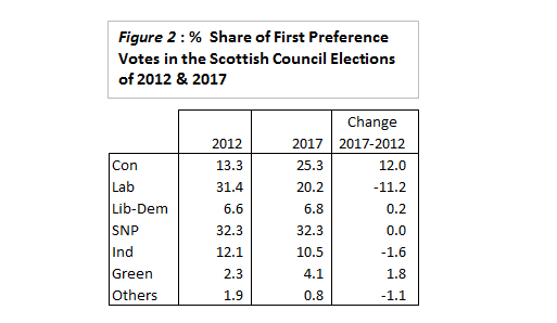 Figure 2 shows the SNP getting again ahead in terms of First Preference Votes, and on the same share as five years ago. The Conservatives are second on 25.3% and Labour third on 20.2%. For comparison, the latest YouGov opinion poll for Scotland of Westminster voting intentions, (of 24-27 April) gave SNP 41, Conservative 28 & Labour 18. People often vote differently in local elections to General Elections, and in Scotland, Independents are quite strong. But the difference is striking, and may indicate where the vote is moving. Compared to the last opinion poll, SNP -9, Conservative -3 and Labour +2. On that basis the Local Elections were bad news for the SNP. The Labour Party appear to have bottomed out, and the Conservatives are doing extremely well.